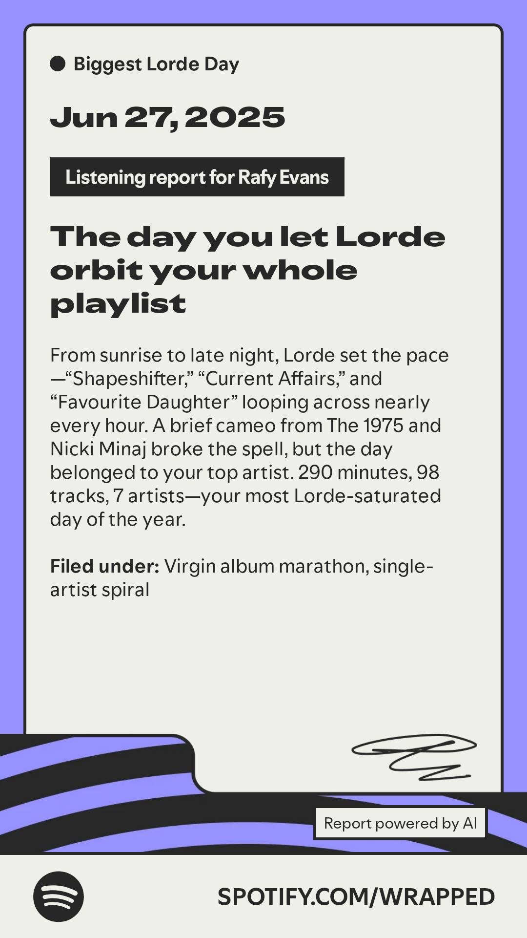 I’m sharing my Spotify Wrapped report as Day 3 of my EOY data analysis. And it sucks that they are evil and run ICE ads because I would like to review my listening history with no stain on my moral conscious.